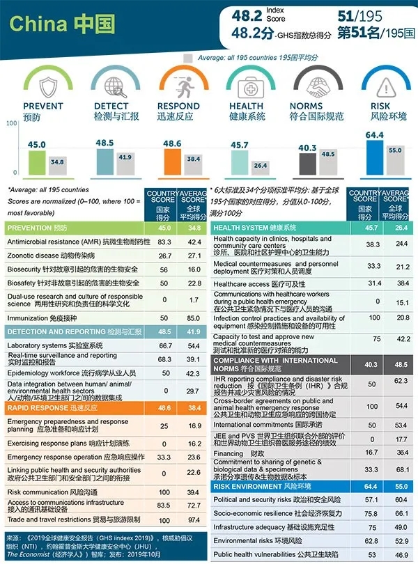 中国的国家健康安全指数分值为48.2分,比全球平均分(40.2分)高8分,排在全球第51位。在195个国家中,有85个国家高出全球平均分,不丹排在第85位(40.3分);有110个国家低于全球平均分,位于南美洲北部的苏里南共和国排在第100位(36.3分);位于西非中南部的贝宁共和国与非洲中部的乍得共和国并列排在第150名(为28.8分);排在榜单最后三位的国家分别为朝鲜(17.5分)、索马里(16.6分)、赤道几内亚(16.2分)。