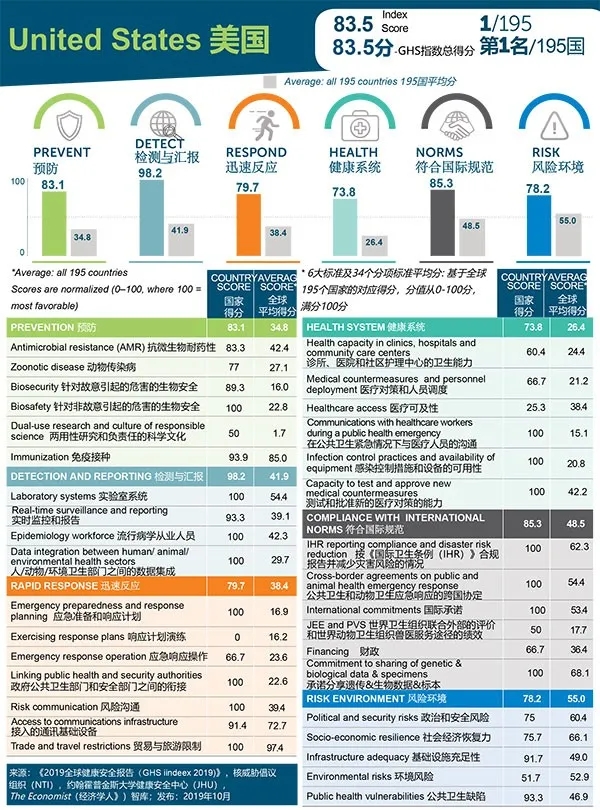 2019》报告分别对195个国家进行打分,以此来评判各国的国家健康安全和对流行传染病等的防控能力。