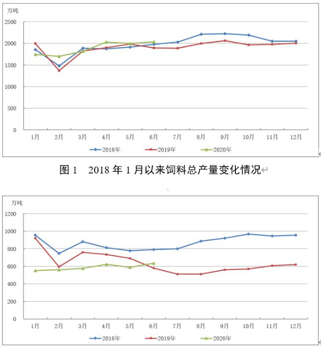 据截至7月6日已填报企业测算,2020年6月,饲料总产量2041万吨,环比增长2.2%,同比增长7.5%。从趋势上看,今年3月、4月和6月饲料总产量环比均增长;2月以后,除3月份同比小幅下降外,其余各月份产量均比上年同期有所增长,6月饲料产量达近三年的高位水平,高于2017年以来的月度平均产量。