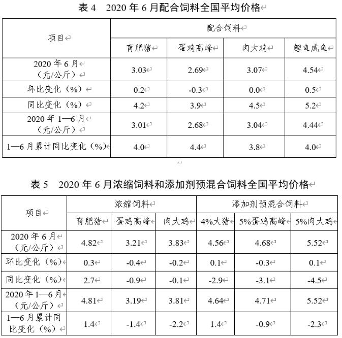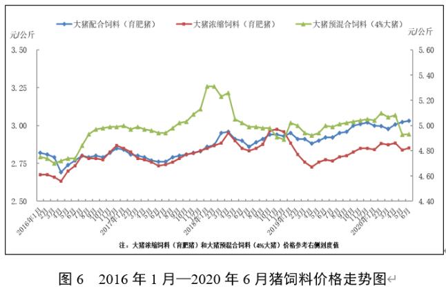 6月份,因玉米价格持续上行,带动麸皮等能量饲料原料价格上涨,配合饲料价格普遍小幅上涨,主要饲料品种价格比上年同期上涨3.9—5.2个百分点。而豆粕等蛋白饲料原料价格下行趋稳,除育肥猪浓缩料同比上涨外,其他浓缩饲料、预混合饲料同比均小幅下降。