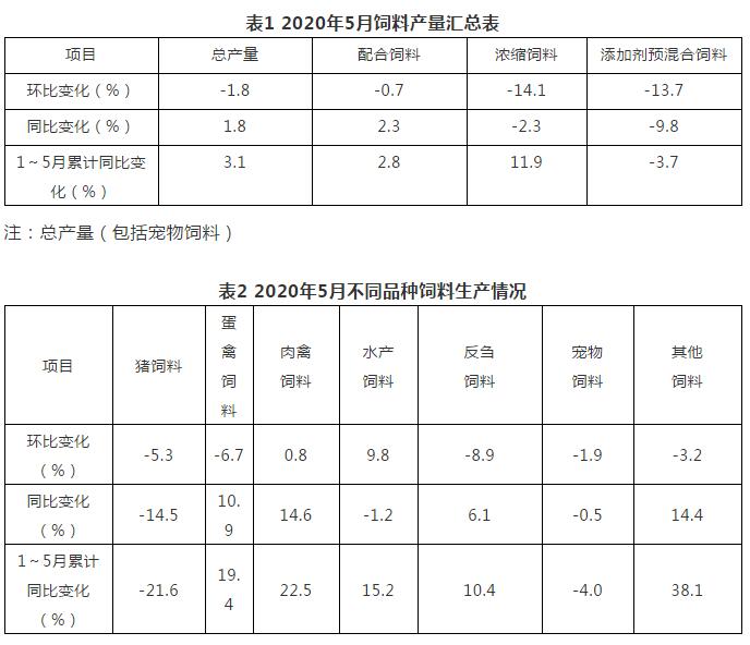 反刍饲料。5月份,全国批发市场牛肉均价70.95元/公斤,环比下降0.7%,同比增长17.6%;羊肉均价66.85元/公斤,环比下降0.8%,同比增长10.9%。牛羊肉价格高位震荡,肉牛羊养殖效益较好,存栏恢复性增长,5月反刍饲料同比增长6.1%。因五一假期提前备货,奶牛生产进入淡季,饲喂需求下降和天气转暖,饲草供应增加,反刍饲料环比下降8.9%。2020年1~5月反刍饲料同比增长10.4%。其中,奶牛饲料同比增长3.2%,肉牛同比增长27.1%,肉羊同比增长11.1%。