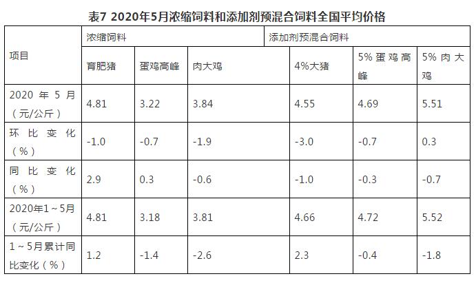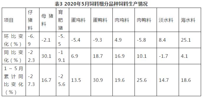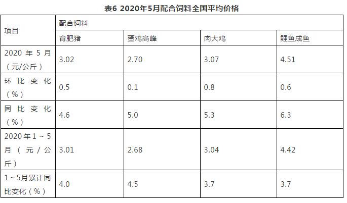 从环比看,自去年9月份开始,猪饲料环比止降转增,截至12月份连续4个月增长。2020年以来,除1月受春节因素环比下降外,2~4月连续3个月增长,5月份,受新冠疫情影响,餐饮、旅游、居民消费水平下降,猪肉消费不振,及进口猪肉、中央储备猪肉投放,5月上旬猪肉价格下跌,压栏大猪出栏增加,猪饲料需求减少。5月,猪饲料环比下降5.3%,其中仔猪饲料、母猪饲料、育肥猪饲料分别下降6.9%、2.1%、5.5%。从同比看,猪饲料同比降幅持收窄,自2019年10月份的41.3%收窄到14.5%。特别是母猪饲料1~5月累计同比增长16.7%,连续4个月累计同比增长,折算配合饲料累计增长7.2%。