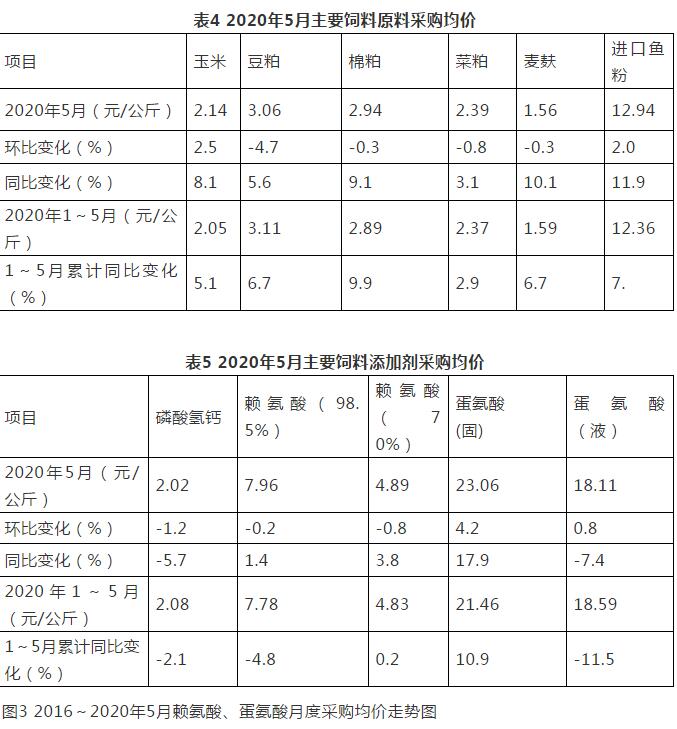5月份,主要饲料原料和添加剂价格涨跌分化。玉米粮源集中在贸易环节,玉米运输、储存成本走高,玉米环比增长2.5%。进口大豆持续增加,豆粕供应由紧张转为宽松,豆粕价格环比下降4.7%。菜粕、棉粕价格环比分别下降0.8%、0.3%。水产养殖进入旺季,支撑鱼粉需求,进口鱼粉价格环比增长2.0%。赖氨酸新增产能释放,价格弱势回调。