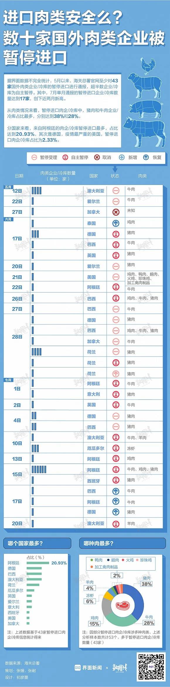 5月以来,海关总署官网至少对43家国外肉类企业/冷库的暂停进口进行通报。其中,超半数国外肉类企业/冷库为自主暂停。分国家来看,来自阿根廷的肉企/冷库暂停进口最多,占比达到20.93%,疫情最严重的美国,肉企/冷库暂停进口占比为2.33%。