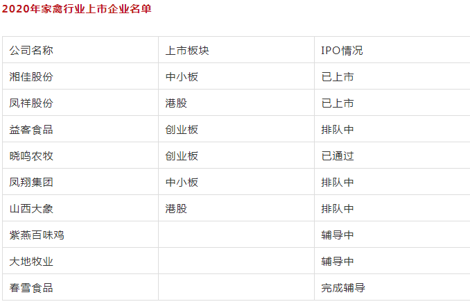 得益于2018-2019年的火热行情,家禽企业相继开始追求上市。仅今年就有9家家禽企业扎堆IPO,这充分说明中小家禽企业的规模化崛起以及行业的景气度。从目前的排队情况来看,下一个上市家禽企业将在江苏益客食品和广西凤翔集团中产生。