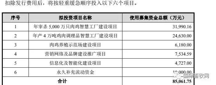 未来三年,公司将新建年宰杀5,000万只的智慧宰杀工厂项目、年产4万吨鸡肉调理品智慧工厂项目、批次饲养规模80万只智慧肉鸡养殖示范基地项目,同时配套发展养殖示范基地,总存栏规模达到1,700万只/批次。保障出栏的毛鸡达到1亿只以上。就上述项目,公司此次拟募资资金8.51亿元,其中补充流动资金1个亿。