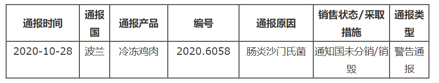 据欧盟食品饲料类快速预警系统(RASFF)消息,2020年10月28日,法国通过RASFF通报波兰出口冷冻鸡肉不合格。具体通报内容如下: