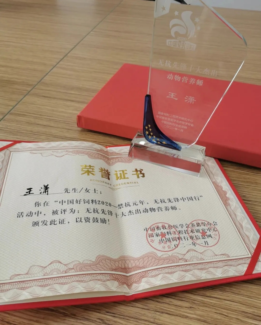 同时,王潇博士凭借20年对无抗饲料的研发贡献,被评为无抗先锋十大杰出动物营养师。