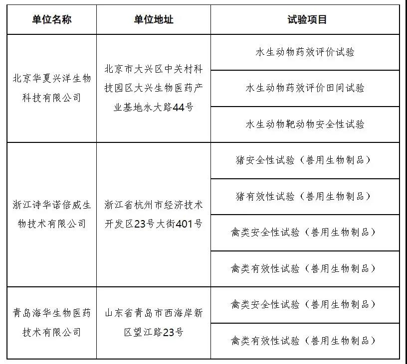 为规范兽药研究活动,根据《兽药管理条例》《兽药临床为规范兽药研究活动,根据《兽药管理条例》《兽药临床试验质量管理规范》以及监督检查标准,我局组织专家对北京华夏兴洋生物科技有限公司、浙江诗华诺倍威生物技术有限公司、青岛海华生物医药技术有限公司等3家单位进行了监督检查。经监督检查,北京华夏兴洋生物科技有限公司等3家单位共9个试验项目符合兽药临床试验质量管理规范要求,现公布监督检查结果,详细信息见中国兽药信息网“兽药GLP\GCP监督检查”专栏。请各省级畜牧兽医主管部门切实做好日常监督管理工作,督促相关单位按照兽药GCP要求开展兽药研究活动。附件:符合兽药临床试验质量管理规范要求的单位和试验项目农业农村部畜牧兽医局