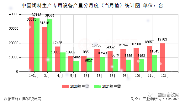数据显示,中国规模以上工业企业2021年11月饲料生产专用设备产量11543.0台,比上年同期下降2.2%,增速较上一年同期高16.8个百分点。