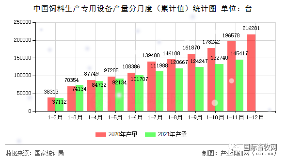数据显示,中国规模以上工业企业2021年1-11月饲料生产专用设备产量145417.0台,比上年同期增长13.4%,增速较上一年同期高30.9个百分点。