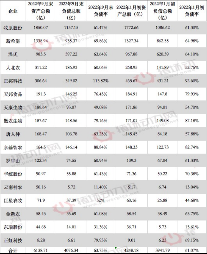 截止到2022年9月底,17家上市猪企资产总额达到6138.71亿元,负债总额高达4076.3亿元。其中牧原以1137.15亿元负债排名第一,新希望接近千亿,达到935.37亿元。