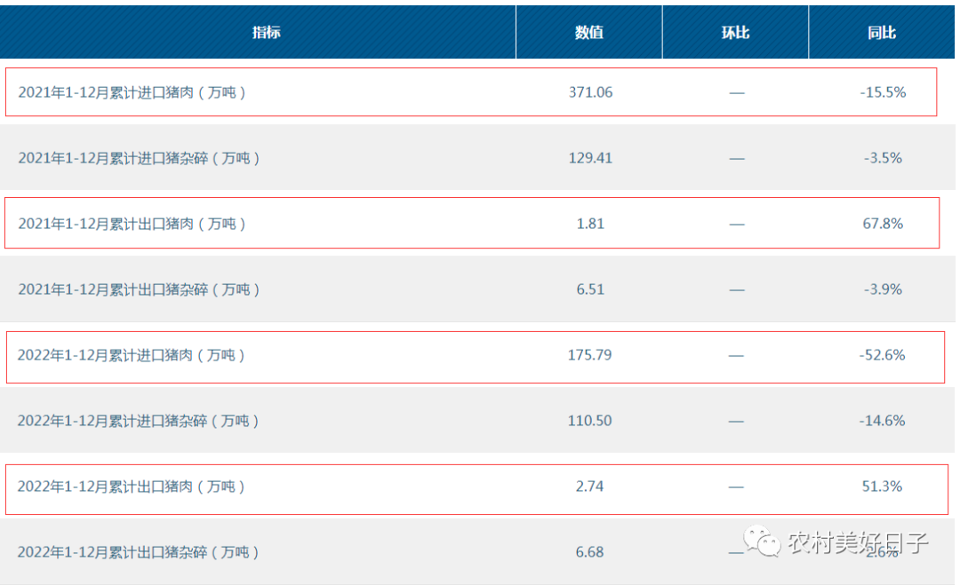 2022年全年,国内累计猪肉进口175.79万吨,同比减少52.6%;累计出口猪肉2.74万吨,同比增加51.3%。
