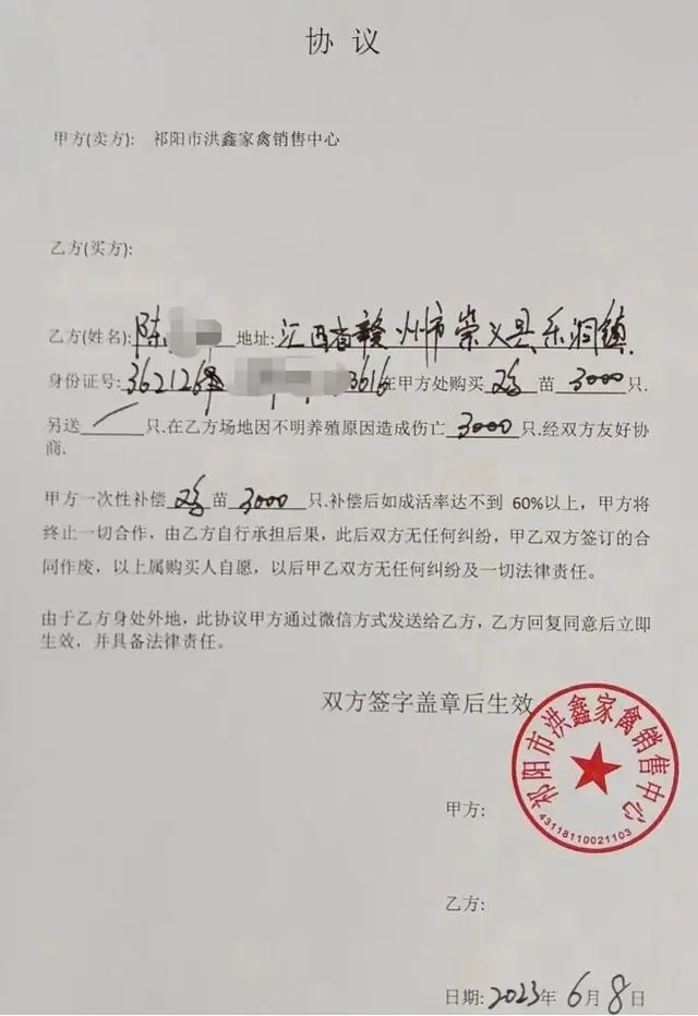 今年5月,江西赣州的陈先生在洪鑫家禽购买了3000只鸡苗,“仅过了一个星期,鸡苗全部死光了。”陈先生告诉记者,他向公司反馈后,6月8日,公司补发了3000只鸡苗,但要求补签一份协议。