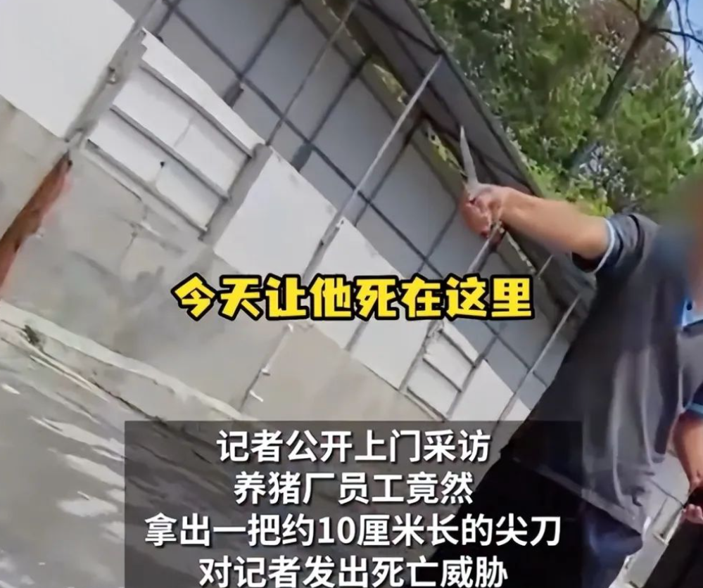 ,记者上门采访,养猪场一员工竟拿一把约10厘米的尖刀对记者发出死亡威胁,狂妄称“如果说你拍,我就让你今天死在这!你是不是想死!”