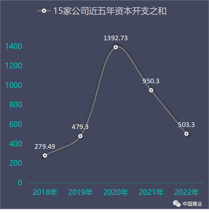 也正是在这一年,有股市和银行源源不断输血的上市猪企不约而同看到了逆势扩张的历史性机会,纷纷把扩产的油门踩到底。2020年15家上市公司资本开支达到1392.73亿元,是2018年开支的近五倍。