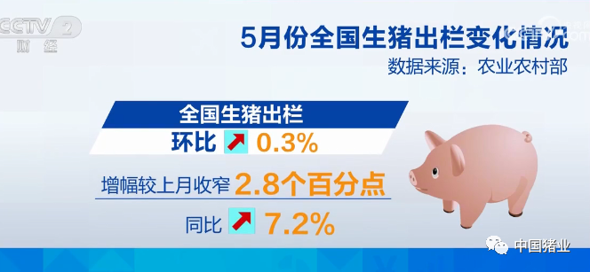 数据显示,5月份,全国生猪出栏同比增长7.2%,环比增长0.3%,增幅较上月收窄2.8个百分点。