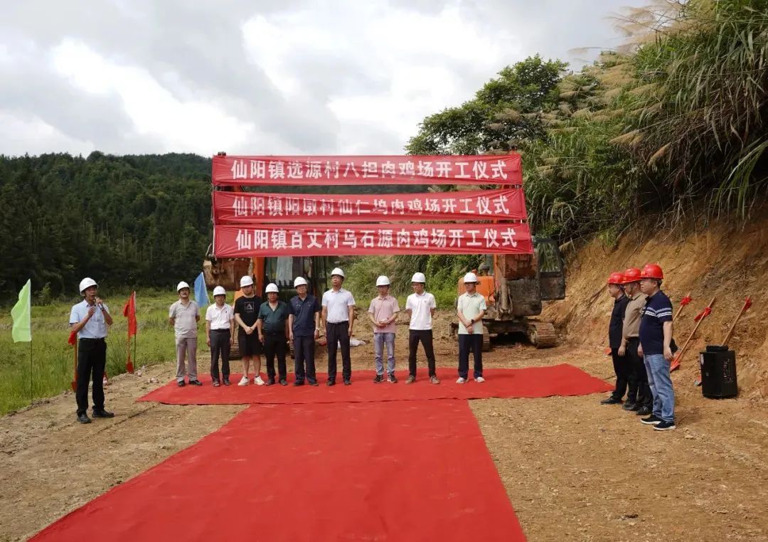 7月5日,圣农浦城公司在仙阳镇举办选源村八担、百丈村乌石源、阳墩村仙仁坞三个肉鸡场开工仪式。