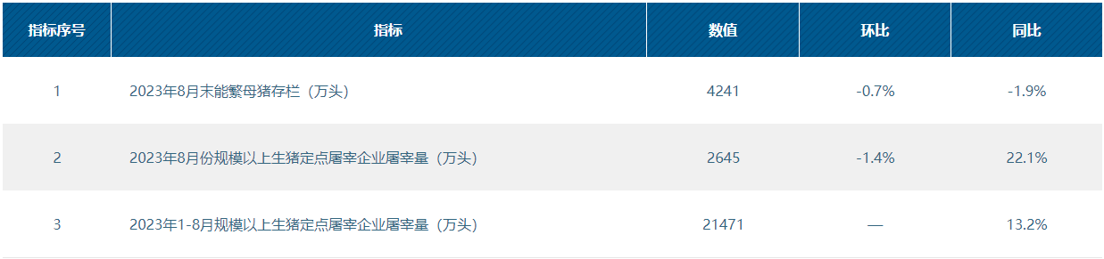 2023年1-8月规模以上生猪定点屠宰企业屠宰量21471万头,同比增长13.2%。