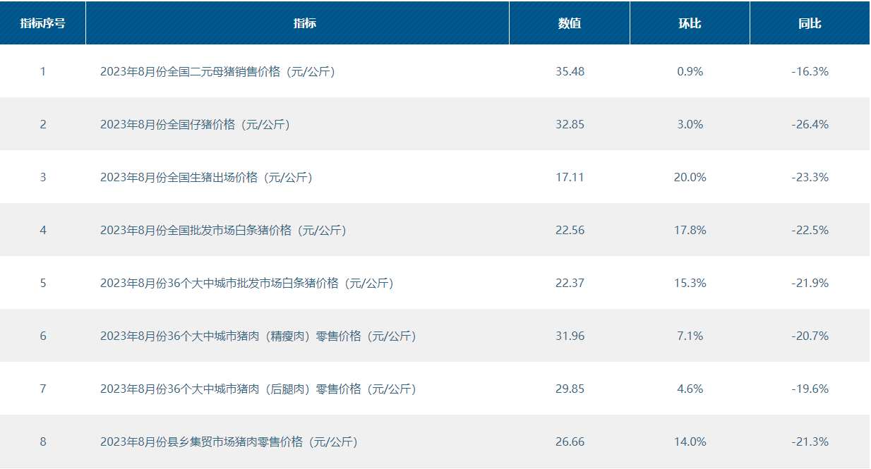 2023年8月份36个大中城市批发市场白条猪价格22.37元/公斤,环比上涨15.3%,同比下降21.9%;
