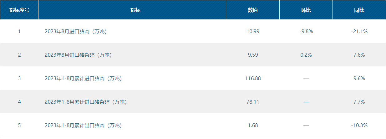 2023年1-8月累计进口猪肉116.88万吨,同比增长9.6%;