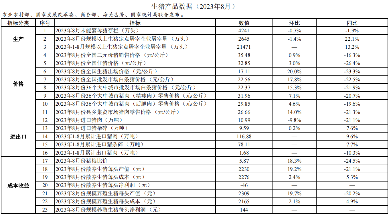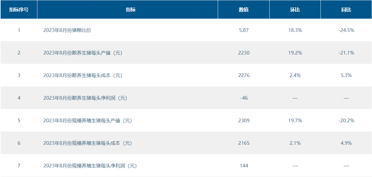 2023年8月份散养生猪每头亏损46元;