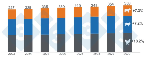 预计从2023年至2030年,全球肉类消费总量将实现显著增长,增幅高达9.6%,总量将从3.27亿吨增长至3.584亿吨。在这一时期,全球牛肉消费预计增长7.3%,总量将达到8020万吨;猪肉消费有望实现7.2%的增长,总量将达到1.31亿吨;禽类消费量则预计将以更快的速度增长,增幅达到13.2%,总量将达到1.475亿吨。