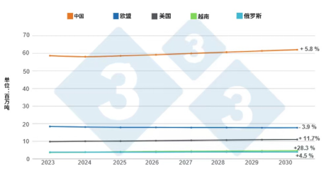 具体国家来看,越南和美国的猪肉消费量预计将呈现强劲增长,增长率分别为28.3%和11.7%。与此同时,中国和俄罗斯的猪肉消费量预计增长率分别为5.8%和4.5%。然而,值得注意的是,欧盟的猪肉消费量预计将出现下滑,预计减少3.9%,从2023年的1840万吨减少至2030年的1770万吨。