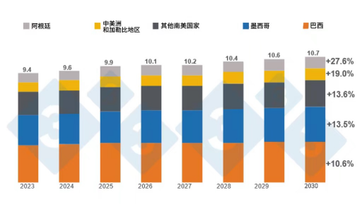 与2023年相比,预计2030年拉丁美洲的猪肉消费量将实现14.2%的显著增长,总量有望达到1070万吨。其中,巴西、墨西哥和阿根廷预计到2030年的猪肉消费量将分别增长至350万吨、300万吨和100万吨,与2023年相比,分别实现10.6%、13.5%和27.6%的增长。此外,中美洲和加勒比地区的猪肉消费总量预计也将在2030年达到100万吨,相较于2023年增长19%。