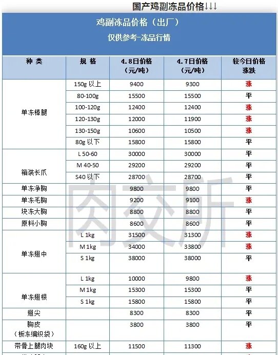 4月8日,冻品行情消息,国产和进口鸡副分割冻品涨了!集中在棒腿、胸类和翅中翅根等,一天涨幅100~200元/吨左右,节后市场出货速度好转,库存压力不大,厂家抬价情绪较高。进口鸡副冻品涨超1000元/吨。家禽产品中毛鸡价格偏强震荡。