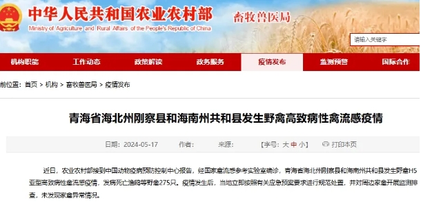 据农业农村部消息,近日,农业农村部接到中国动物疫病预防控制中心报告,经国家禽流感参考实验室确诊,青海省海北藏族自治州刚察县和海南藏族自治州共和县发生野禽H5亚型高致病性禽流感疫情,发病死亡渔鸥等野禽275只。