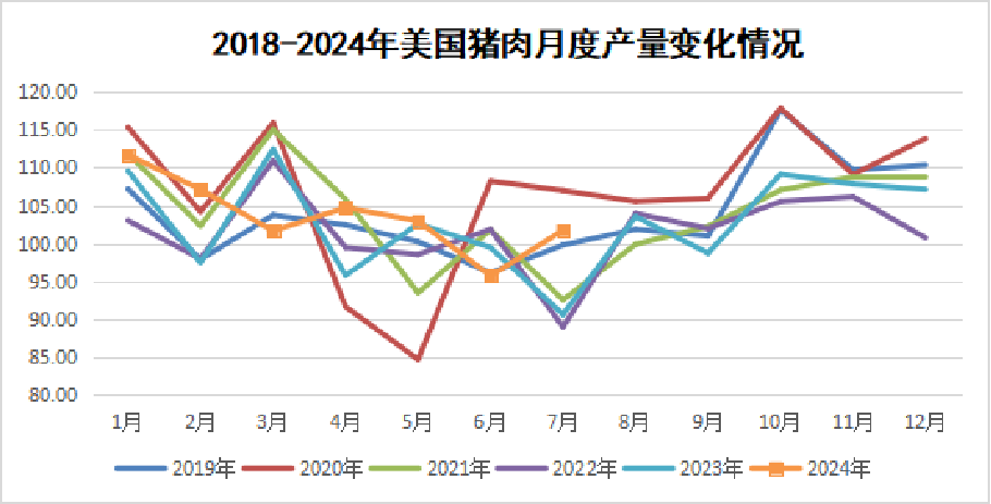 产量方面:近期美国猪肉产量明显增长;7月份美国猪肉产量101.7万吨,同比增12.3%;1—7月猪肉产量725.5万吨,同比增2.5%。