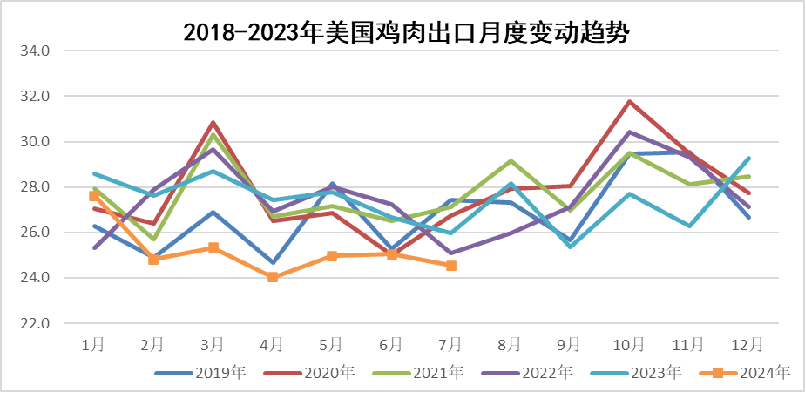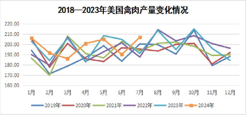 产量方面:美国禽肉单月产量明显增加,累积较去年同期略增;7月份禽肉产量206.9万吨,同比增8.3%;1~7月禽肉产量1386.6万吨,同比增0.5%。