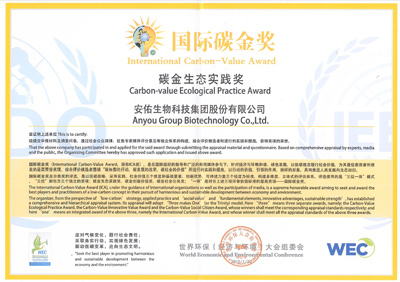 “国际碳金奖(International Carbon-Value Award,简称ICA奖)” 是在联合国和专业性国际组织的指导和媒体的参与下,由国际环保大会(WEC)组织实施,针对在经济与环境和谐、绿色发展,以低碳理念履行社会价值,为其最佳表现者所颁发的最高荣誉奖项,以行动的价值,引领的作用,榜样的形象,共同推进人类发展向生态回归。历届获奖者包括联合利华、联想、强生、平安保险、五粮液、百度、伊利等国际知名企业。此次共有75家企业获得提名候选资格,安佑集团因在生态农业领域所取得的成果和可持续性创新优势成功斩获“碳金生态实践奖”。