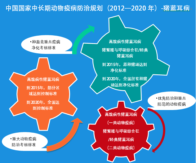 《国家中长期动物疫病防治规划(2012—2020年)》的“优先防治和重点防范的动物疫病”条目中,把“高致病性猪蓝耳病”列为“一类动物疫病”;把“猪繁殖与呼吸综合征/经典猪蓝耳病”列为“二类动物疫病。重大动物疫病防治考核标准要求,对于高致病性猪蓝耳病,到2015年,部分区域达到控制标准;到2020年,全国达到控制标准;种畜禽重点疫病净化考核标准条目要求:高致病性猪蓝耳病及猪繁殖与呼吸综合征/经典猪蓝耳病,到2015年,原种猪场达到净化标准;到2020年,全国所有种猪场达到净化标准。