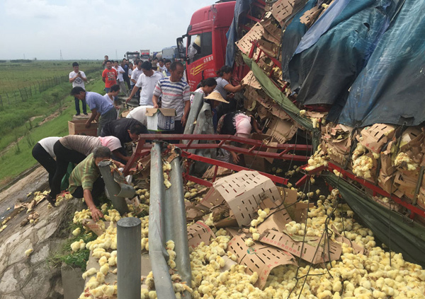 山东运禽货车倾翻 数万小鸡遭村民疯抢