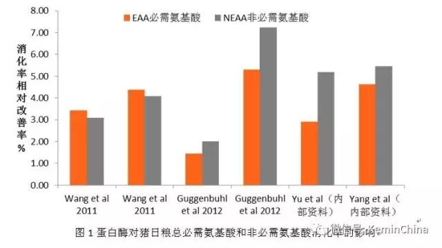 必需氨基酸的营养对养殖动物至关重要,而非必需氨基酸尤其是其中一些功能性的NEAA不足也会影响猪的免疫和生产性能。通过添加有效的蛋白酶不仅可以提高EAA的消化率,同时蛋白酶也可以提高NEAA的消化率(图1)。