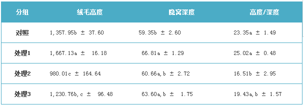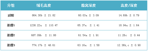 表三. 35日龄肉鸡十二指肠绒毛组织形态