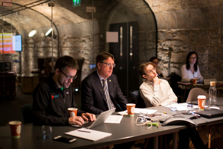 皮尔斯?莱昂斯博士加速器项目选拔初创公司进入农业企业创新者服务的指导项目。从左至右:项目顾问Jon Bradford,奥特奇首席创新官Aidan