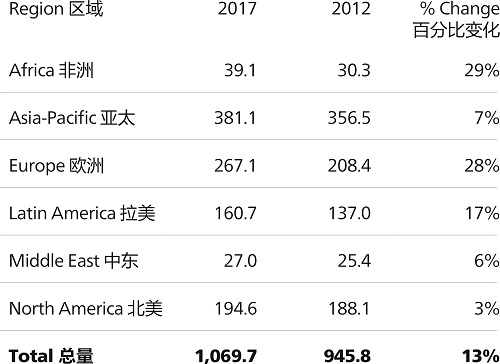 去年,奥特奇全球饲料调查报告估计全球动物饲料产量首次突破10亿吨。今年,我们的估算已经确认2017年饲料总产量再次突破10亿吨大关,达到10.7亿吨。