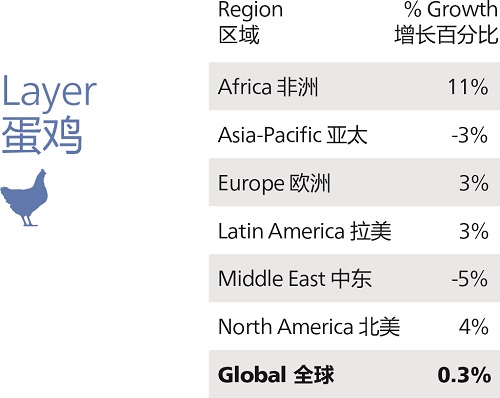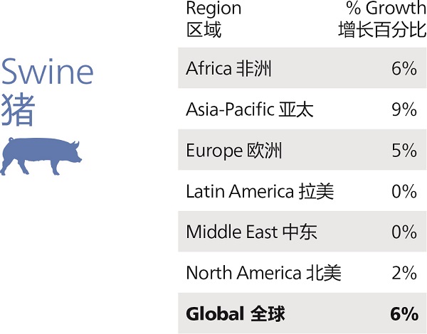 肉鸡饲料是另外一个在所有地区都实现增长的饲料产业。其中,增幅最大的是非洲(10%)和欧洲(7%)。埃及、乌干达、莫桑比克和摩洛哥为非洲的肉鸡饲料产业贡献了130万吨的增长。罗马尼亚、俄罗斯和乌克兰的报告显示也都有所增长,推动了欧洲肉鸡饲料总产量的上升。