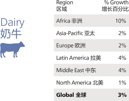 乳制品是少数几个在所有地区都实现增长的产业之一。作为全球乳制品产业的领头羊,虽然欧洲实施的共同农业政策改革对牛奶产量带来了巨大的影响,但是该地区的平均增长仍有约2%。从增长百分比来讲,成绩最耀眼的要数非洲,奶牛饲料产量增长达10%。但是,与其他地区相比,获取有关非洲国家的产量数据的难度仍然较大,但是本调查显示南非、摩洛哥和津巴布韦等国家2017年的报告奶牛饲料产量都显著增加。