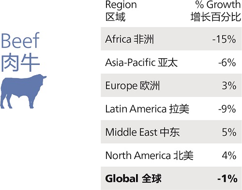 肉牛产业增长稍有停滞。全球总产量下降了1%,其中拉丁美洲、非洲和欧洲的产量都出现下滑。随着肉类消费更多转向鸡肉、猪肉和鱼肉等“白肉”,这个全球范围内的产量下降趋势已经在产业内持续了一段时间。