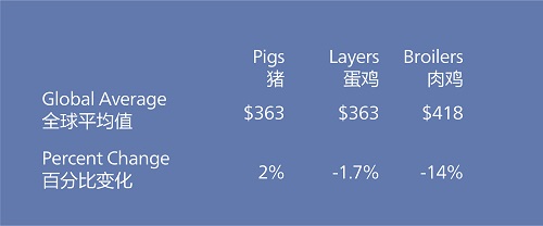 在选择对猪、蛋鸡和肉鸡肥育饲料成本进行评估的过程中,奥特奇选择基于全球范围内相对同质的配方对这些饲料进行比较。全球范围内,猪肥育饲料成本平均比2016年增加了2%。考虑到猪饲料产量增加了大约5.54%,这表明该产业去年的增长强劲。