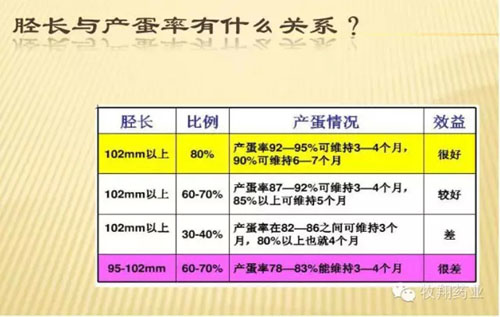 育成期体形发育的好坏直接影响其生产性能的发挥,胫长达标而体重偏轻的鸡群,产蛋早期蛋重小,产蛋率上升缓慢,产蛋高峰偏低;胫长不达标而体重超标的鸡群会出现过早产蛋或发生严重脱肛等现象,死淘率高,高峰维持时间短;如果胫长和体重都不达标,就意味着育雏育成失败,开产时间延长,产蛋高峰达不到标。