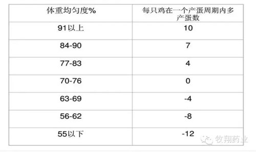 鸡群均匀度是衡量蛋鸡育成期饲养是否成功的关键指标之一。鸡群的均匀度包括体重均匀度、胫长均匀度以及性成熟均匀度。均匀度高说明鸡群生长发育一致,预示着日后鸡群开产一致,产蛋高峰值高,高峰期维持时间长。鸡群体重、胫长均匀度分别用群体中体重、胫长在平均值上下10%范围内的鸡只所占的百分比来衡量。理想的育成鸡,体重、胫长均匀度应达到90%以上。