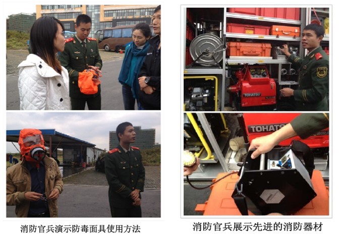 培训之后,杨警官指派消防官兵向大家展示并讲解了现代化的消防装备。并重点指出,在火场中如何正确的佩戴防烟面具,可有效的防止高温、有毒气体。