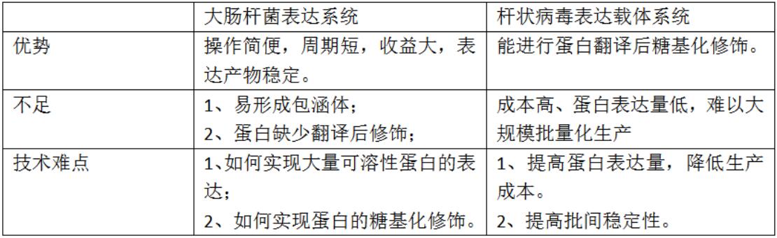 昆虫杆状病毒表达载体系统是利用携带有外源目的基因的重组昆虫杆状病毒作载体在昆虫体内或昆虫培养细胞进行表达生产的一个重组蛋白生产系统。由于该系统所需要的周期远比动物或植物系统短,可以利用昆虫个体或其培养细胞进行大规模的表达生产,生产的重组蛋白产量高,蛋白翻译后加工比细菌、酵母生产系统完善,而且由于昆虫杆状病毒具有限制性的宿主范围,只对特定种属的昆虫及其细胞进行感染,对人畜等脊椎动物没有感染能力,因此具有比在哺乳动物及其培养细胞生产系统更为安全等优点而成为目前最有效的真核表达系统之一。(表1)
