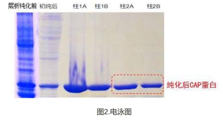 国家兽用药品工程技术研究中心多位专家经过长期研究,通过多重蛋白层析纯化,获得了高纯度的Cap蛋白,将Cap蛋白的纯度提高至95%以上,从而为后续高效的组装完整的病毒样颗粒奠定了基础。(图1,2)