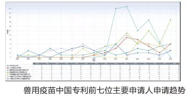 文章还对兽用疫苗中国专利前七位主要申请人历年的申请趋势作出了分析。